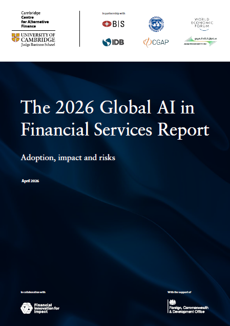 The 2026 Global AI in Financial Services Report provides a unique contribution towards our collective understanding of the adoption and impact of AI in the financial services sector, at the intersection of financial services providers, AI vendors, regulators as well as users and consumers. This global research initiative was conducted by the Cambridge Centre for Alternative Finance (CCAF) at Cambridge Judge Business School, in partnership with the Bank for International Settlements, the International Monetary Fund, the World Economic Forum, the Inter-American Development Bank, CGAP, the Arab Monetary Fund, and in collaboration with Financial Innovation for Impact and with the support of the UK Foreign, Commonwealth and Development Office (FCDO).